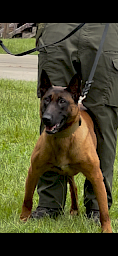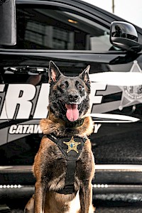 The Sheriff"s Office currently has seven K9's. There is one assigned to each of the four road patrol platoons, one to the Narcotics division and two to the Community Relations-SRO's. Six of our K9's are Belgian Malinois and one of our newest additions is a German Shorthaired Pointer. The Belgians are all dual purpose trained with the German Shorthaired only being narcotics and tracking trained. They are trained in tracking, handler protection, off-leash obedience, article, area and building search, criminal apprehension and narcotics detection. Each of them originated in Europe and underwent several months of intensive training. Pictured below from left to right are K9's Drax, Loki, Odin, Storm, Thor, Nova and Ivey.