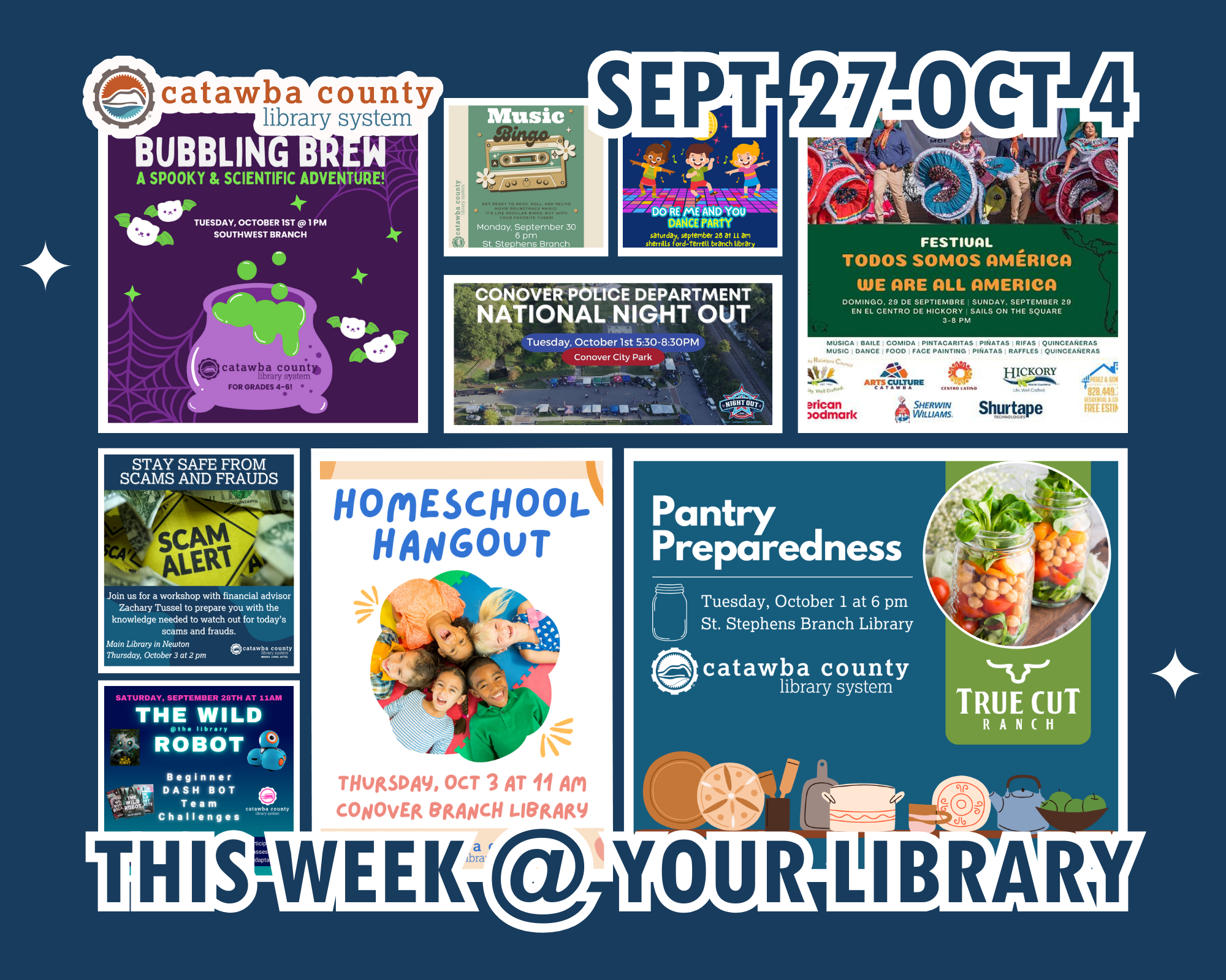 Join us at your library this coming week for scam & fraud safety, music bingo, the wild robot, bubbling brew STEAM adventure, & preparing your pantry!...