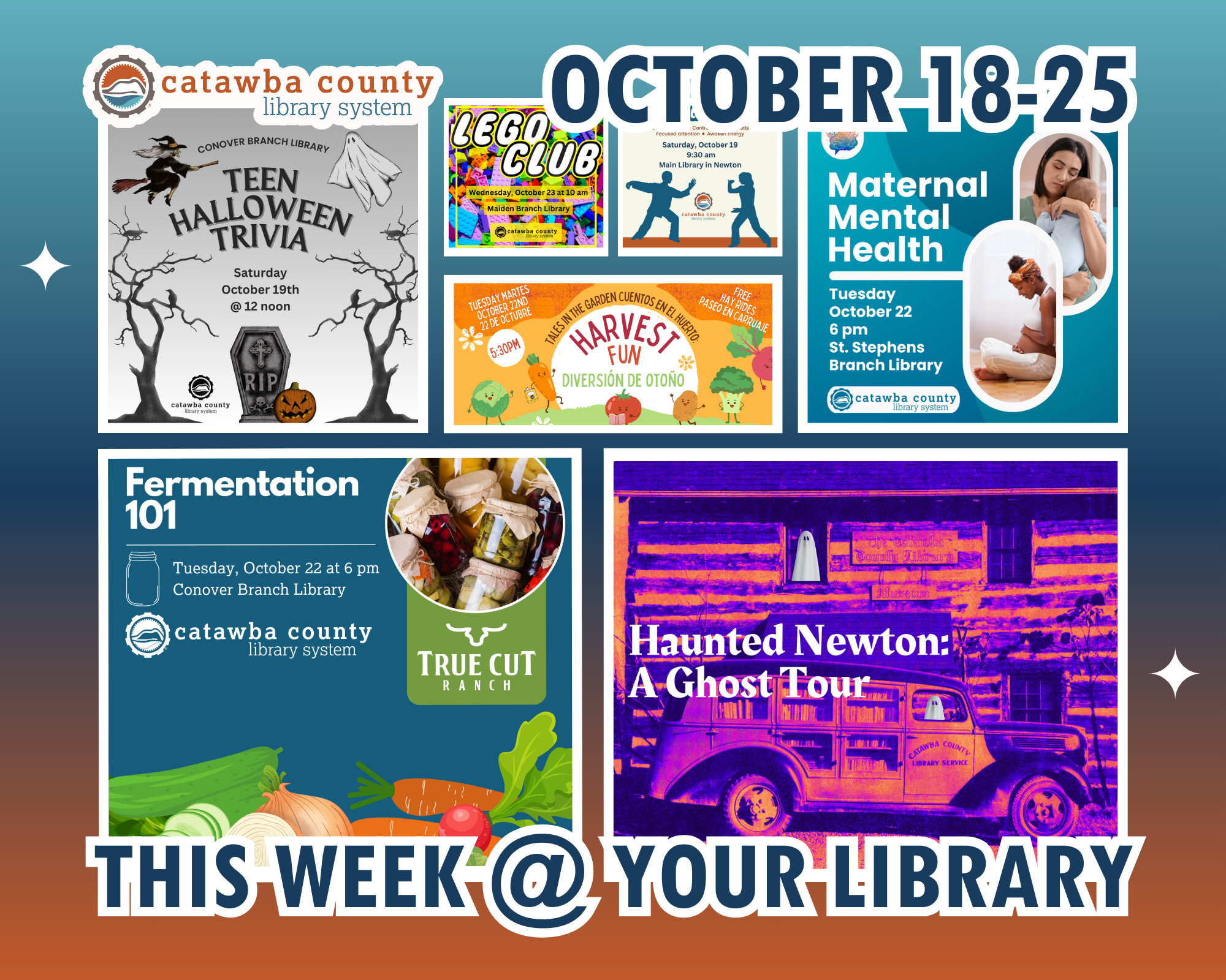 Join us at your library this coming week for Lego club, Harvest Fun with Murray's Mill, teen Halloween trivia, maternal mental health, & ghost tours!...