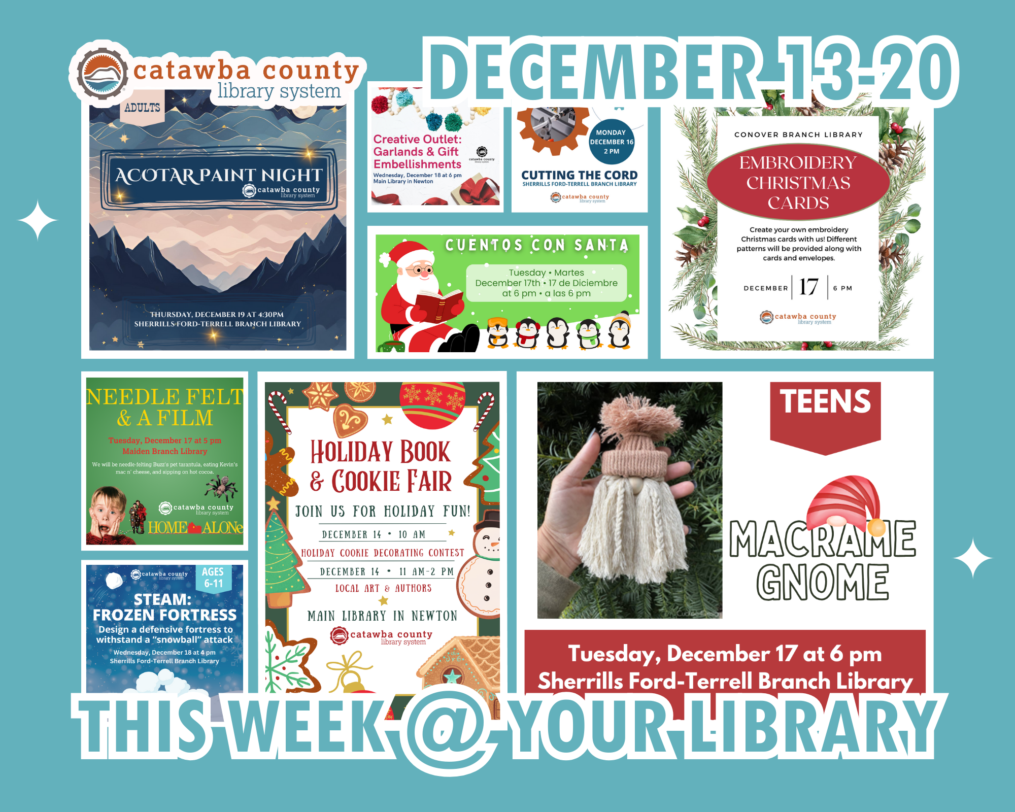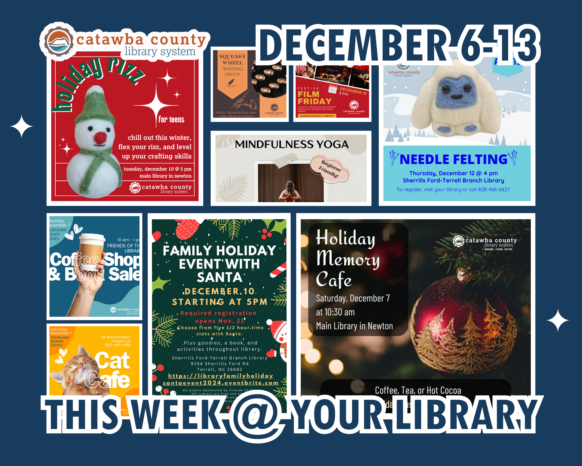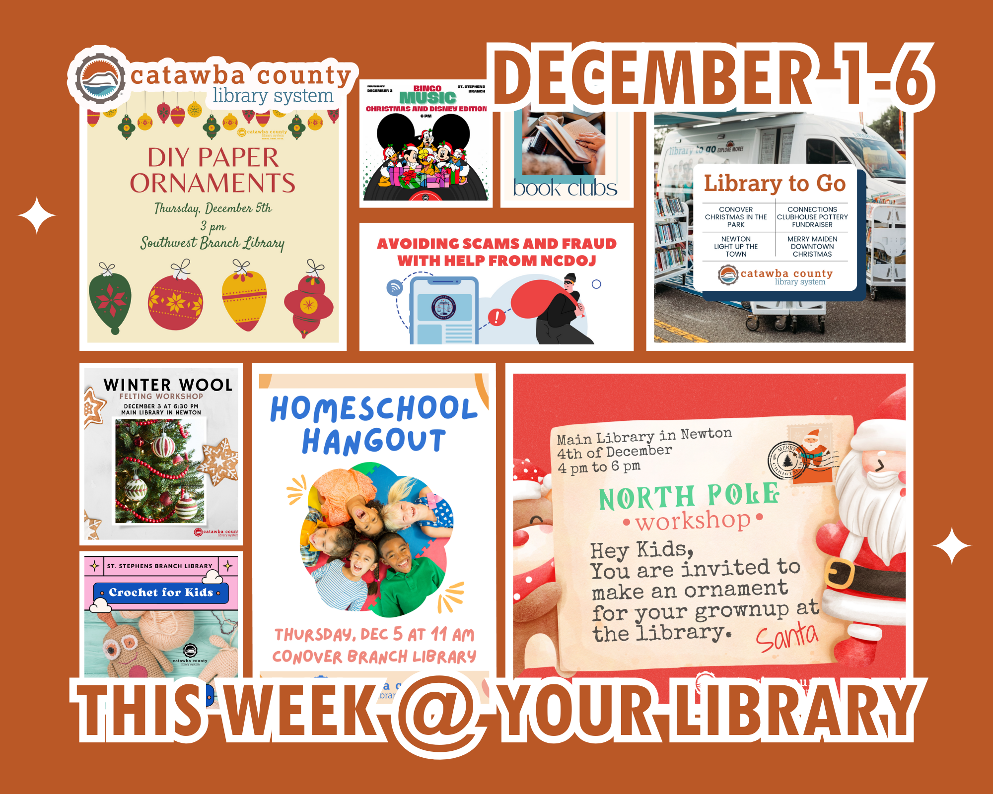 Join us at your library this coming week for Caturday Crafts, DIY ornaments, gentle flow yoga, and to pick up movies & books before the holiday break!...