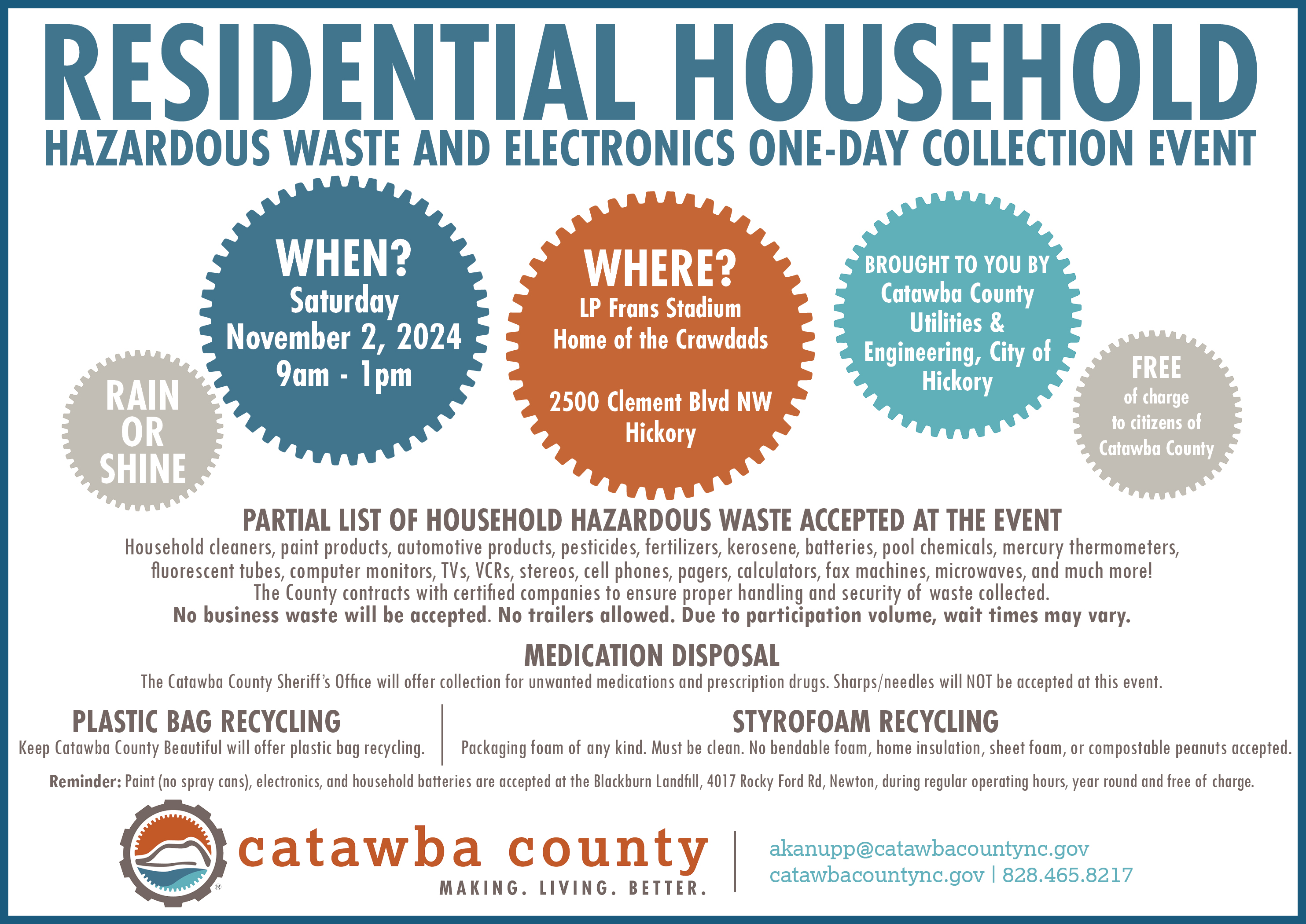 Catawba County’s annual fall residential household hazardous waste collection event will take place Saturday, November 6 from 9 a.m. to 1 p.m. at LP Frans Stadium...