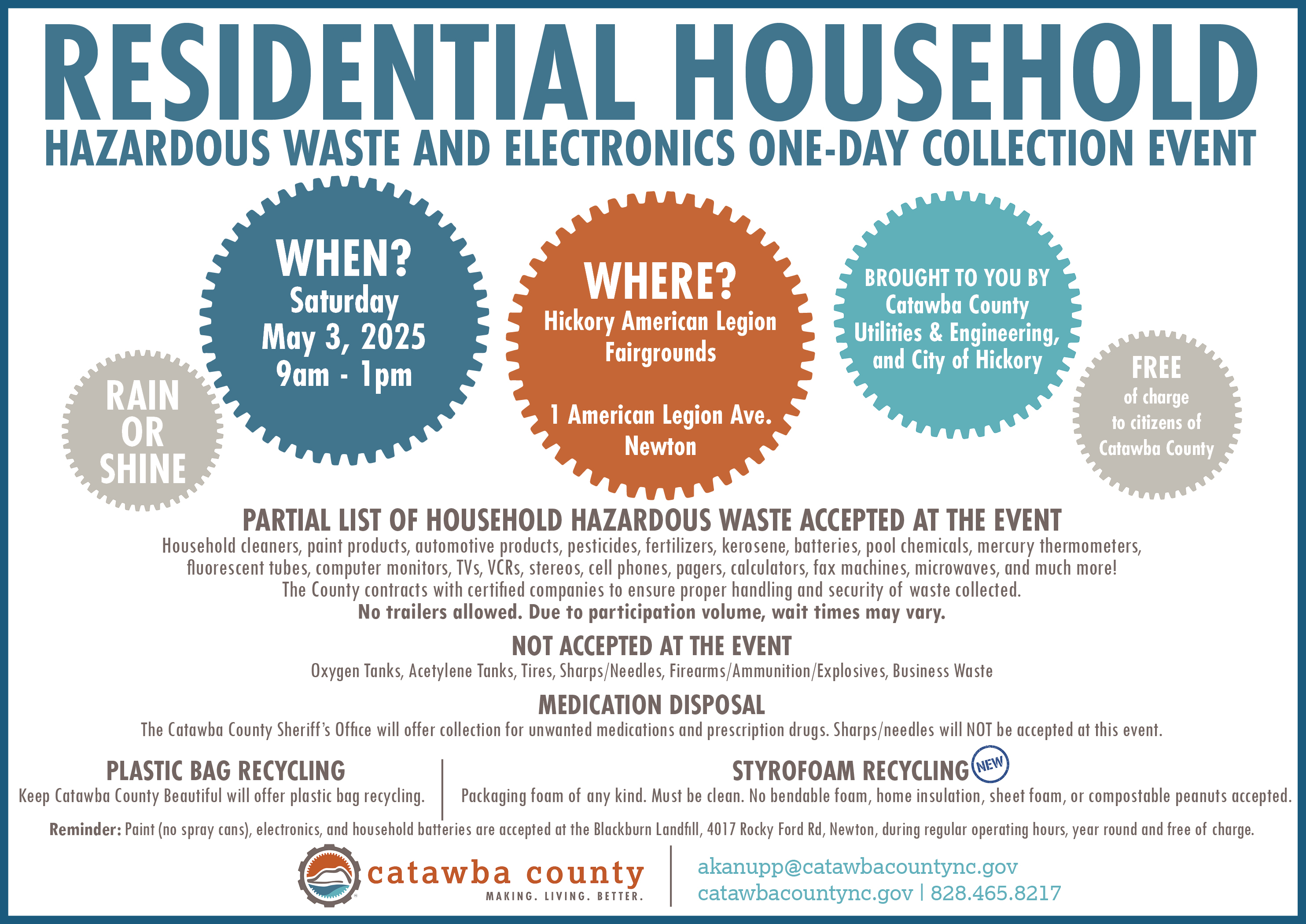 Catawba County’s annual spring residential household hazardous waste collection event will take place Saturday, May 7 from 9 a.m. to 1 p.m. at the Hickory American Legion...