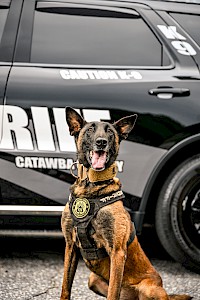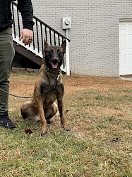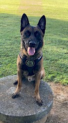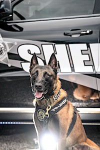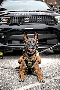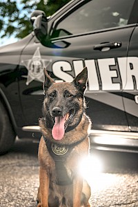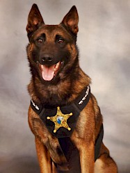 The Sheriff"s Office currently has seven K9's. There is one assigned to each of the four road patrol platoons, one to the Narcotics division and two to the Community Relations-SRO's. Six of our K9's are Belgian Malinois and one of our newest additions is a German Shorthaired Pointer. The Belgians are all dual purpose trained with the German Shorthaired only being narcotics and tracking trained. They are trained in tracking, handler protection, off-leash obedience, article, area and building search, criminal apprehension and narcotics detection. Each of them originated in Europe and underwent several months of intensive training. Pictured below from left to right are K9's Drax, Loki, Odin, Storm, Thor, Nova and Ivey.
