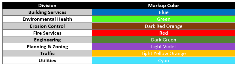 To create consistency amongst the jurisdictions for our applicants, the following colors should be used by the different divisions/departments for any markups which they create while using Bluebeam Revu for plan reviews.