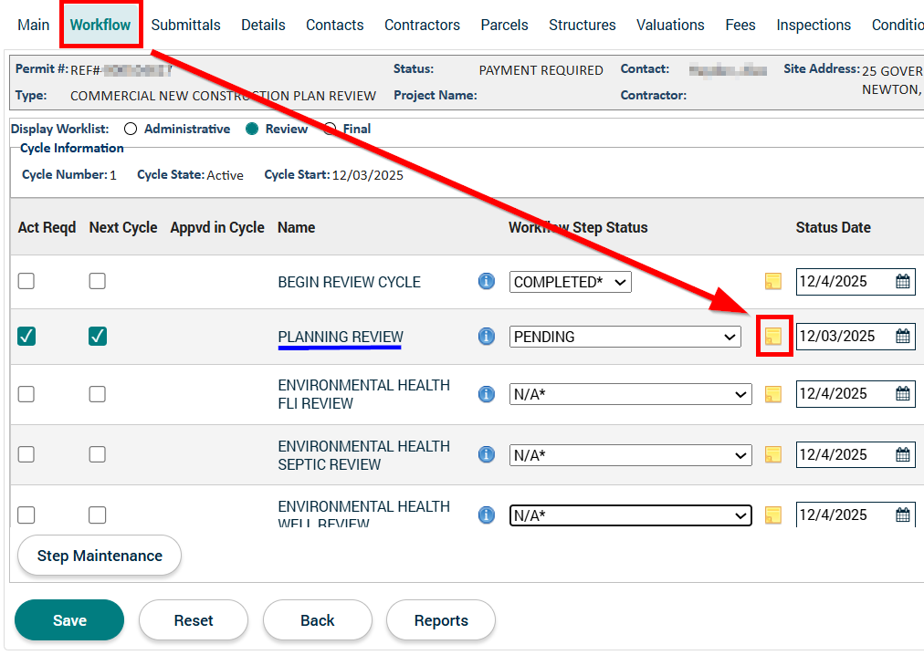1. Navigate to the Workflow tab on the application and then click on the yellow sticky notesymbol on the same row as your division's Review Workflow Step.