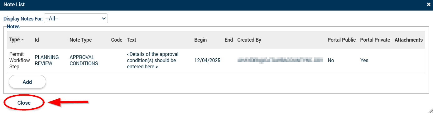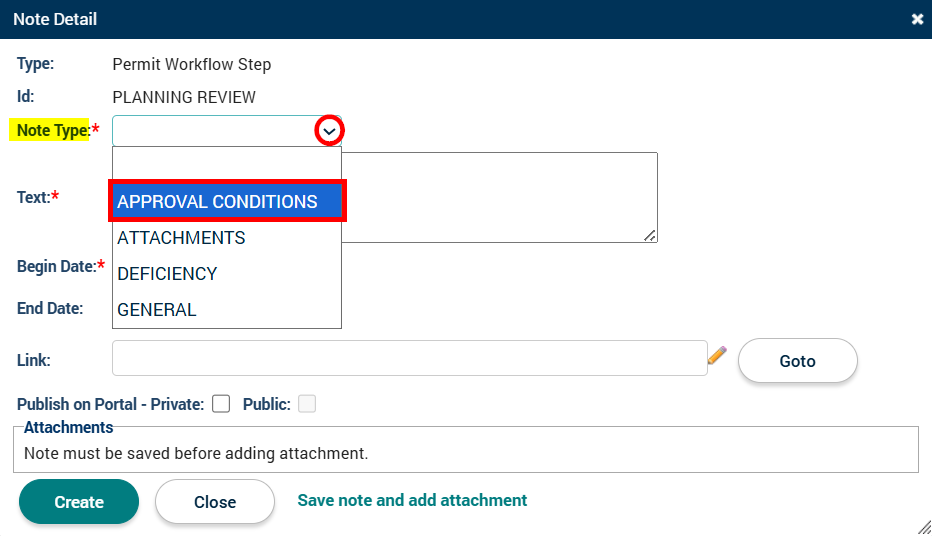 3. In the "Note Detail" pop-up window, select APPROVAL CONDITIONS from the "Note Type" dropdown.