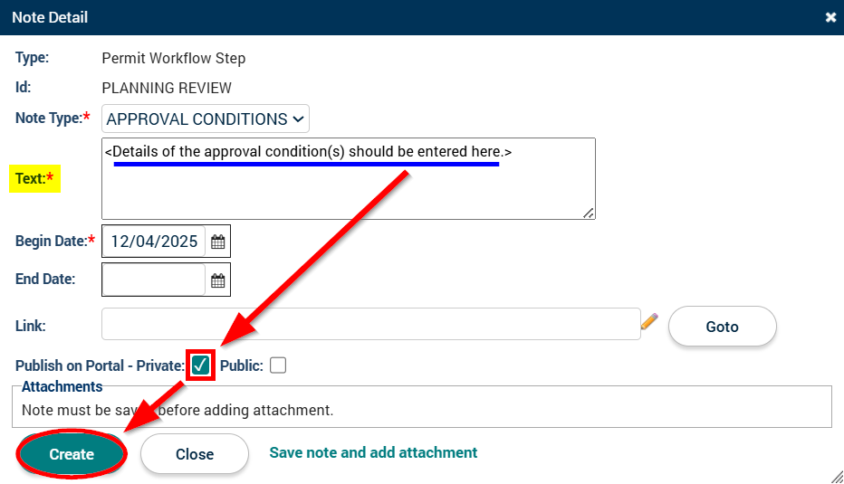 4. Enter the specifics of the approval condition(s) into the "Text" box, check the box next to "Private" to make sure the applicant can see the APPROVAL CONDITIONS note in the ePermits Public Portal, and then click on the Create button.