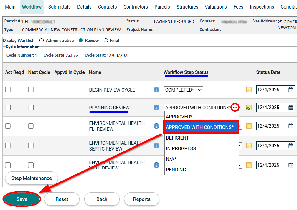 6. Lastly, on your division's Review Workflow Step, select APPROVED WITH CONDITIONS from the Workflow Step Status dropdown and then click the Save button.