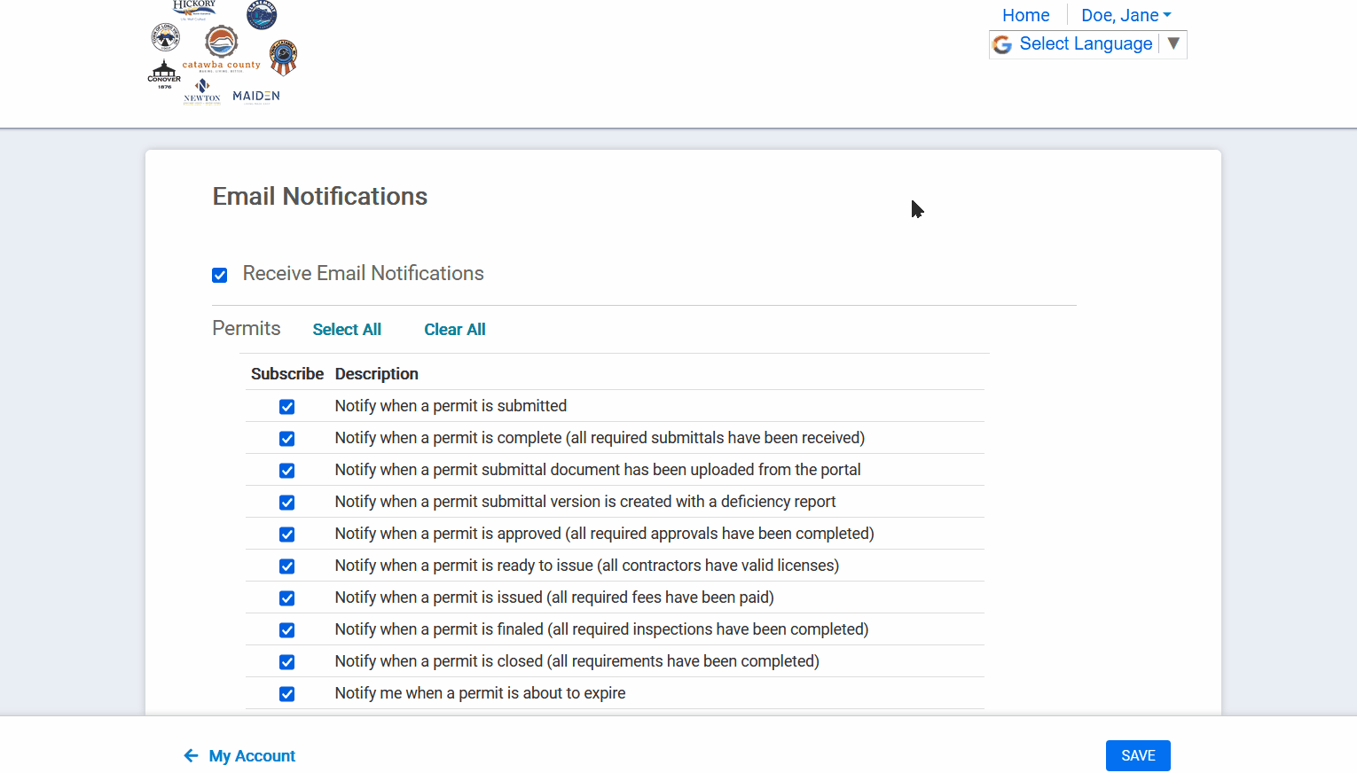 3. On the email notifications webpage, uncheck any notifications you wish to no longer receive and then click on Save.