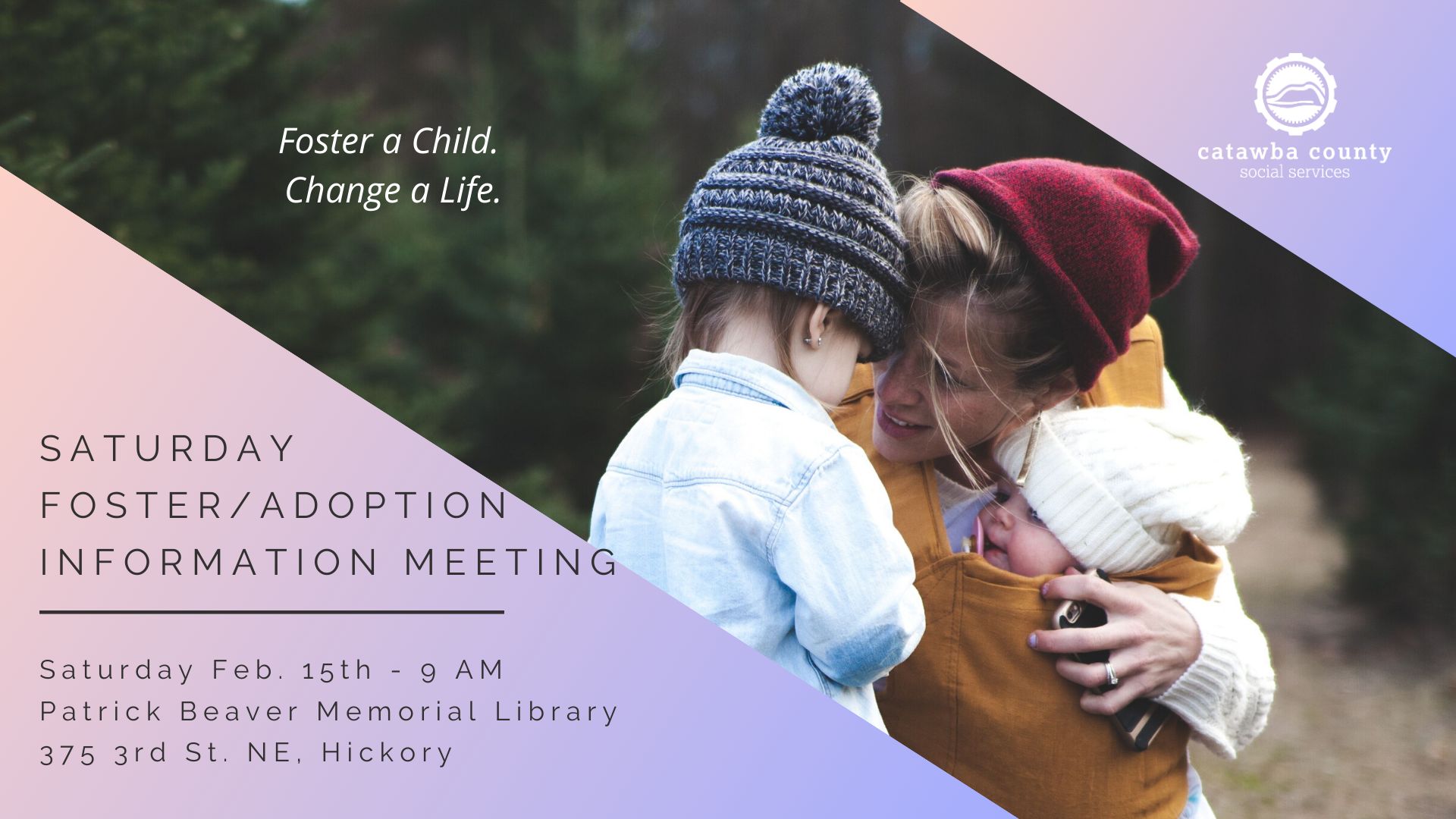 Family Builders of Catawba Valley invites anyone interested in fostering or adopting a child to attend the resource family information meeting on Saturday Feb. 15th from 9:00-10:30 AM. The meeting will be held at Patrick Beaver Memorial Library, 375 3rd St. NE, Hickory, NC 28601.