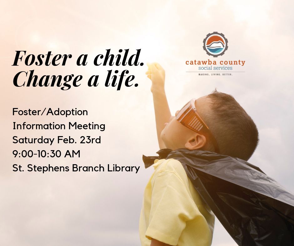 Family Builders of Catawba Valley invites anyone interested in fostering or adopting a child to attend the resource family information meeting on Saturday February 23rd from 9:00-10:30 AM. The meeting will be held at St. Stephens Branch Library, 3225 Springs Road NE, Hickory, NC 28601.
