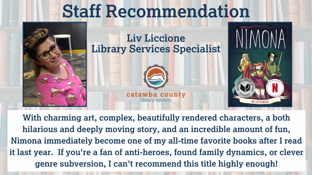 "With charming art, complex, beautifully rendered characters, a both hilarious and deeply moving story, and an incredible amount of fun, Nimona immediately become one of my all-time favorite books after I read it last year. If you're a fan of anti-heroes, found family dynamics, or clever genre subversion, I can't recommend this title highly enough!"