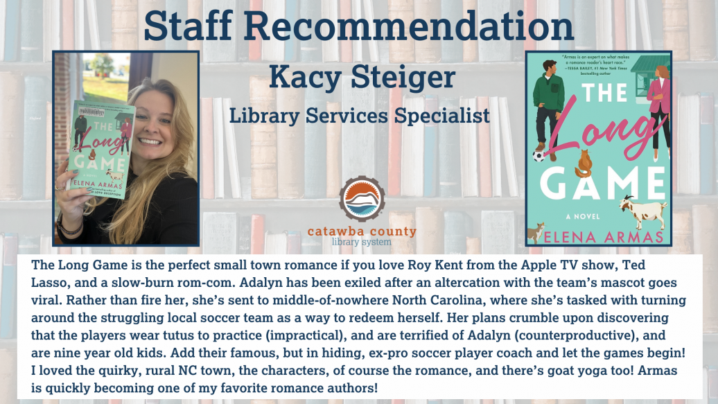 "The Long Game is the perfect small town romance if you love Roy Kent from the Apple TV show, Ted Lasso, and a slow-burn rom-com. Adalyn has been exiled after an altercation with the team’s mascot goes viral. Rather than fire her, she’s sent to middle-of-nowhere North Carolina, where she’s tasked with turning around the struggling local soccer team as a way to redeem herself. Her plans crumble upon discovering that the players wear tutus to practice (impractical), and are terrified of Adalyn (counterproductive), and are nine year old kids. Add their famous, but in hiding, ex-pro soccer player coach and let the games begin! I loved the quirky, rural NC town, the characters, of course the romance, and there’s goat yoga too! Armas is quickly becoming one of my favorite romance authors!"