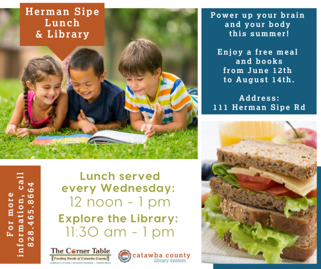 The Catawba County Library, in partnership with the Backpack Program and the Community Kitchen of The Corner Table, will provide weekly lunch-and-library sessions at 111 Herman Sipe Road in Conover, near Oak Grove Mobile Home Park. The Library to Go will offer books and resources as you enjoy a free, hot meal on-site. Everyone is welcome to attend.